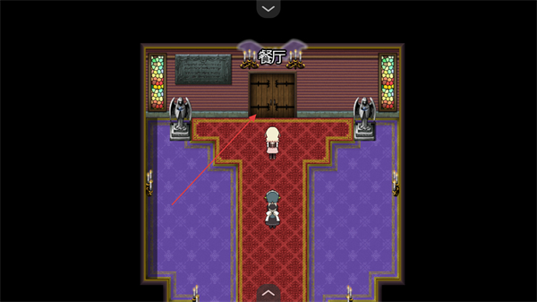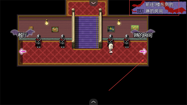 2、進(jìn)入到室內(nèi)時(shí),與女仆對(duì)話完后,有明確的箭頭指引路線,需前往餐廳地點(diǎn)推進(jìn)流程。