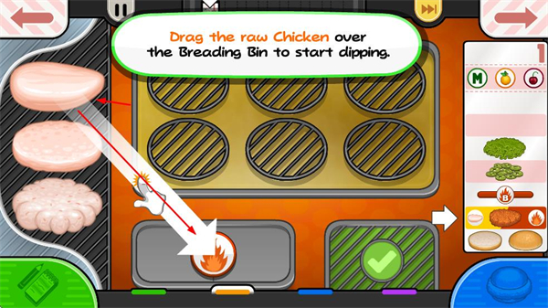 1、將生雞肉拖拽至裹粉槽,開始裹粉流程,為炸雞制作做準(zhǔn)備。