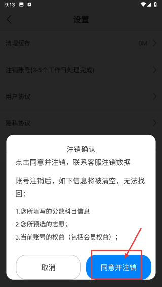 4、在提示框中,點(diǎn)擊同意并注銷按鈕,完成賬號(hào)注銷操作。