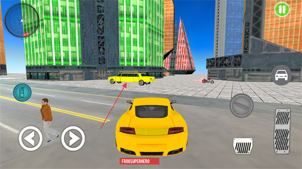2、切換駕駛黃色跑車,通過方向鍵和油門在城市道路行駛,快速移動。