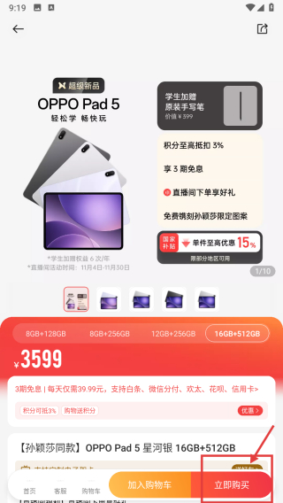 4、在產(chǎn)品詳情頁,點擊立即購買按鈕,進行該平板的購買操作。