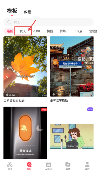 2、在模板推薦頁面,點(diǎn)擊秋天分類,瀏覽秋天主題模板列表。