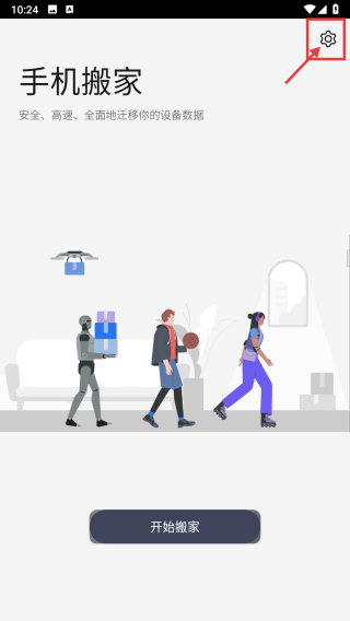 1、打開手機(jī)搬家類APP,點(diǎn)擊右上角設(shè)置圖標(biāo),進(jìn)入設(shè)置頁面。