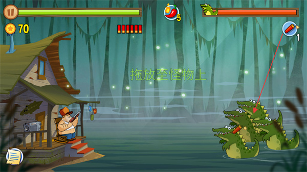 4、面對(duì)多只鱷魚時(shí),拖放道具至怪物上,造成范圍傷害,擊敗鱷魚群。