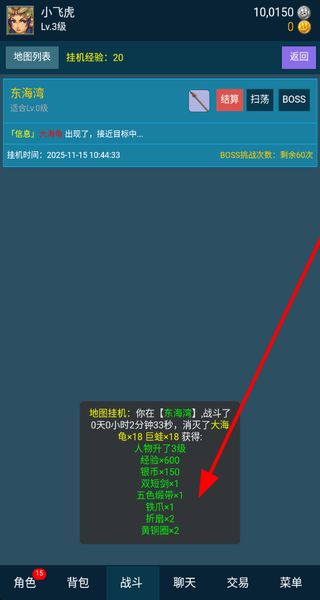 2、獲取掛機(jī)獎(jiǎng)勵(lì),通過(guò)地圖掛機(jī)戰(zhàn)斗,消滅怪物,獲得經(jīng)驗(yàn)、銀幣和各類道具,助力角色的成長(zhǎng)和發(fā)展。