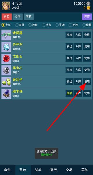 3、使用背包道具,在背包中選擇舍利子等道具并使用,獲取相應(yīng)的物品或效果,提升角色的屬性或解鎖新功能。