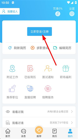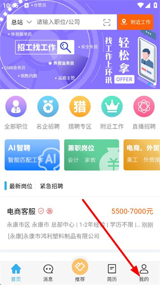 1、在求職APP首頁,點擊底部我的,進(jìn)入個人頁面。