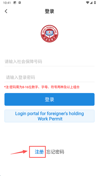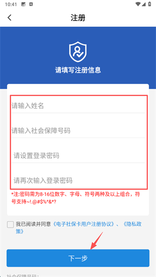 4、在注冊信息頁面,依次輸入姓名、社會保障號碼,設(shè)置并確認(rèn)登錄密碼,勾選協(xié)議后點擊下一步按鈕,完成賬號注冊操作。