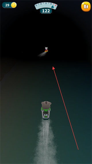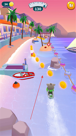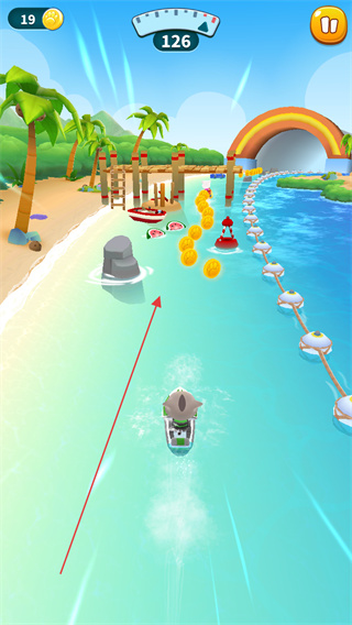3、在黃昏場景的賽道上,避開船只和巖石,收集金幣,向終點(diǎn)前進(jìn)。