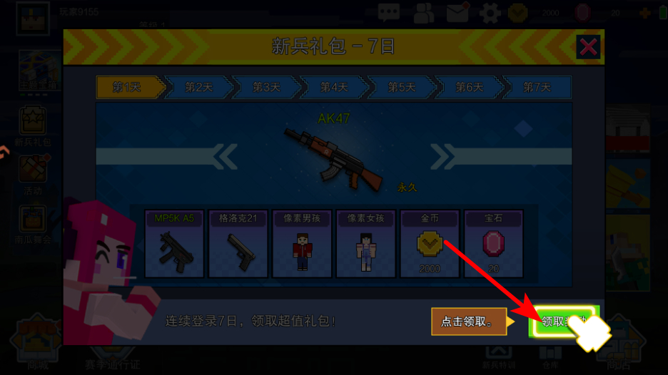 2、點擊領(lǐng)取獎勵按鈕,可獲取新兵禮包的豐厚資源,這是積累戰(zhàn)力的關(guān)鍵步驟,領(lǐng)取時需及時操作以獲取武器和道具。