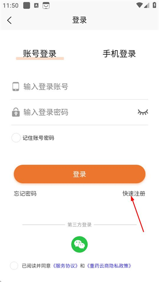2、在登錄頁面,點擊快速注冊選項,進入注冊頁面。
