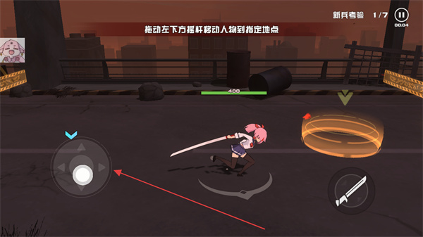 1、拖動左下方搖桿移動人物到指定地點(diǎn),熟悉移動操作。