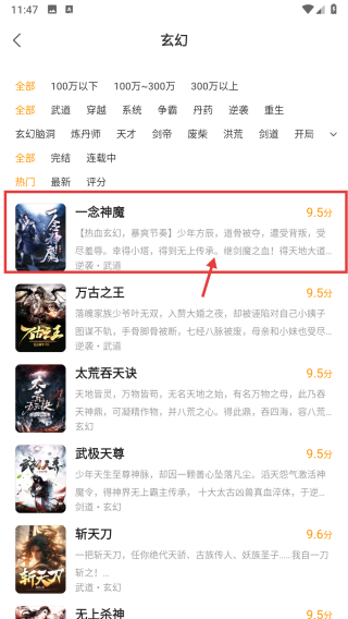 3、在玄幻小說列表里,選擇一念神魔條目,進(jìn)入小說詳情頁。