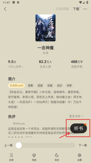 4、在小說詳情頁,點擊聽書按鈕,開始收聽該小說的音頻內(nèi)容。