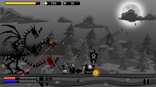 采用暗黑系美術(shù)風(fēng)格構(gòu)建橫版戰(zhàn)場,陰沉色調(diào)搭配破碎的城堡、荒涼的山脈等場景元素,營造出神秘且充滿壓迫感的氛圍,貼合惡龍守護(hù)寶藏的主題。