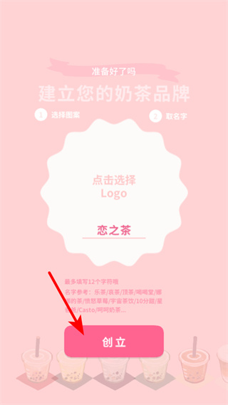 2、點(diǎn)擊創(chuàng)立按鈕,可建立自己的奶茶品牌,這是開(kāi)啟游戲經(jīng)營(yíng)之旅的關(guān)鍵步驟,創(chuàng)立時(shí)選擇合適的Logo品牌名稱。