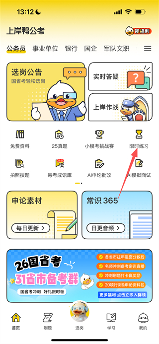 1、在上岸鴨公考首頁,點(diǎn)擊限時(shí)練習(xí)選項(xiàng),進(jìn)入限時(shí)練習(xí)頁面。