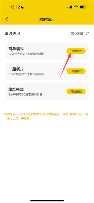 2、在限時(shí)練習(xí)頁面,選擇練習(xí)模式,點(diǎn)擊開始挑戰(zhàn)按鈕,進(jìn)入答題頁面。