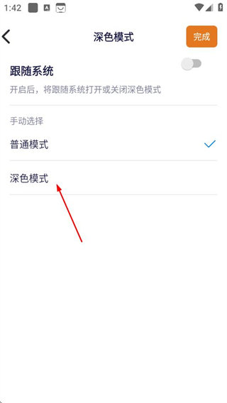 4、在深色模式設(shè)置頁(yè)面,選擇深色模式后點(diǎn)擊完成,可切換為黑夜模式。