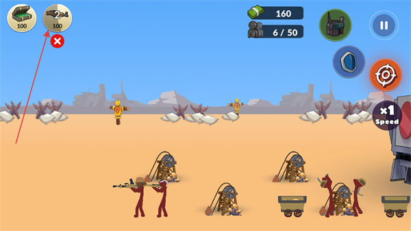 1、點擊左上角兵種圖標,派遣火柴人士兵出戰(zhàn),攻擊敵方單位。