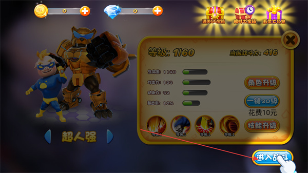 1、點(diǎn)擊進(jìn)入游戲,選擇角色超人強(qiáng)進(jìn)入戰(zhàn)斗關(guān)卡。