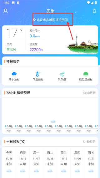 1、打開(kāi)天氣類APP,點(diǎn)擊頂部地址區(qū)域,進(jìn)入地址選擇頁(yè)面。
