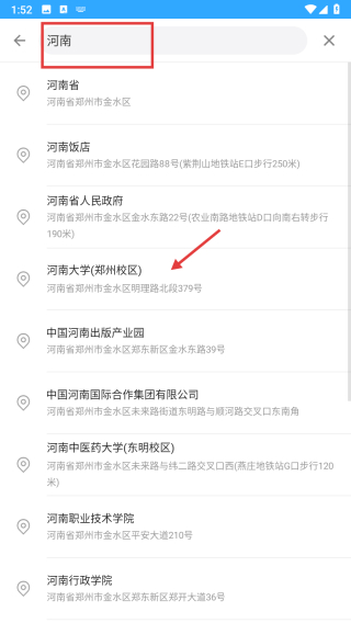 3、在地址搜索結(jié)果頁(yè),選擇鄭州市金水區(qū)相關(guān)地址如河南大學(xué)鄭州校區(qū),進(jìn)入天氣詳情頁(yè)面。