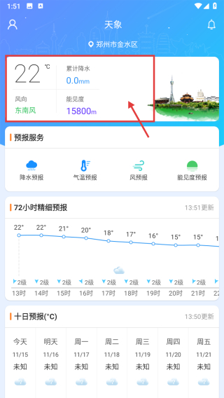 4、在天氣詳情頁(yè)面,查看鄭州市金水區(qū)的天氣信息如溫度22℃、風(fēng)向東南風(fēng)等。