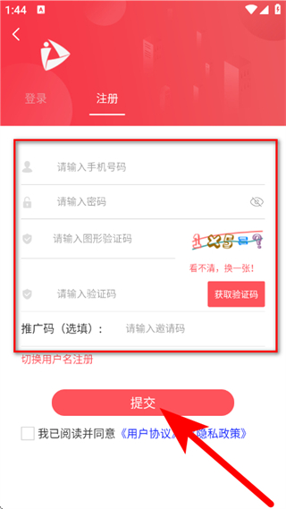 4、輸入手機(jī)號(hào)碼、密碼、圖形驗(yàn)證碼、驗(yàn)證碼,勾選已閱讀并同意后,點(diǎn)擊提交,完成注冊(cè)。