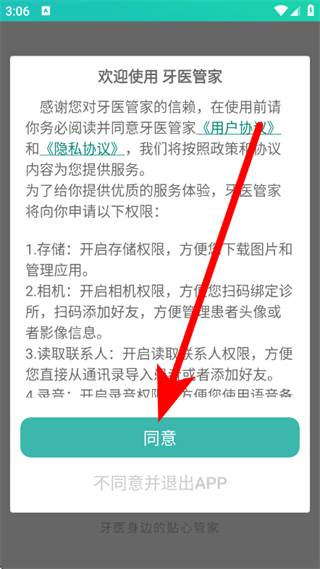 1、打開牙醫(yī)管家,在歡迎彈窗中,點(diǎn)擊同意。