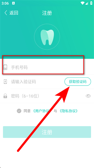 3、在注冊(cè)頁(yè)面,輸入手機(jī)號(hào)碼后,點(diǎn)擊獲取驗(yàn)證碼。