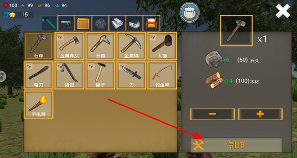 2、收集石頭和木材等資源,在制作界面制作石斧,獲取工具,助力荒野中的資源采集和生存。