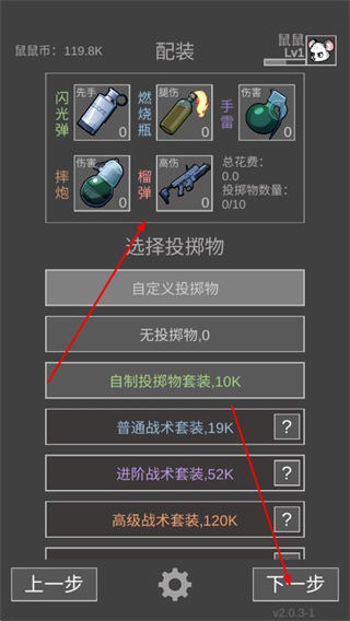 2、在配裝界面選擇投擲物,如閃光彈、燃燒瓶等,搭配自制或戰(zhàn)術(shù)套裝,提升戰(zhàn)斗能力。