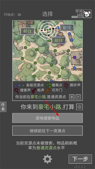 3、在資源點(diǎn)選擇原地搜索物品或前往下一資源點(diǎn),注意行動(dòng)點(diǎn)消耗。