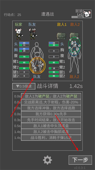 4、遭遇戰(zhàn)時(shí)關(guān)注戰(zhàn)斗詳情,根據(jù)敵我屬性與戰(zhàn)術(shù)選擇,指揮老鼠擊敗敵人,獲取戰(zhàn)斗獎(jiǎng)勵(lì)。