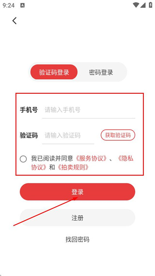 3、在登錄頁面選擇驗證碼登錄,輸入手機號和驗證碼,勾選協(xié)議后點擊登錄完成操作。