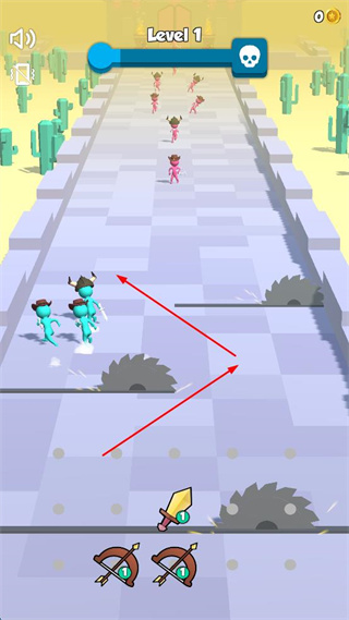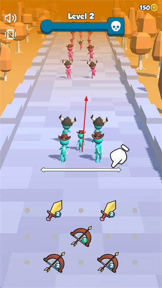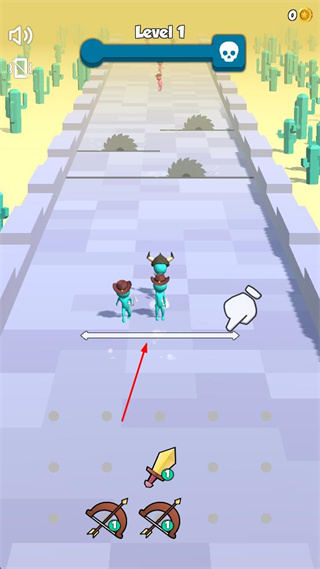 4、進入第二關(guān)后,按照指示上下滑動屏幕,調(diào)整火柴人團隊的縱向位置,繼續(xù)開展跑酷戰(zhàn)斗。