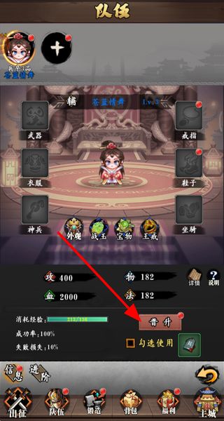 4、晉升角色,在隊(duì)伍界面消耗經(jīng)驗(yàn)晉升角色,提升角色的屬性和能力,助力在三國(guó)志世界的征戰(zhàn)。