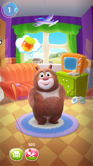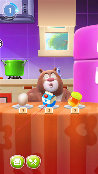 3、選擇一種食物拖動(dòng)進(jìn)行喂食給熊大,獲取左上角的經(jīng)驗(yàn)值。