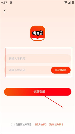 3、在登錄頁面輸入手機號和驗證碼,勾選協(xié)議后點擊快速登錄完成登錄操作。