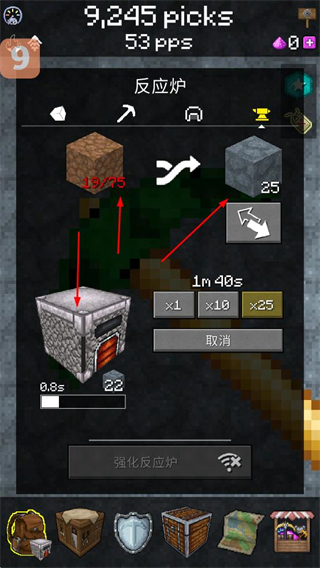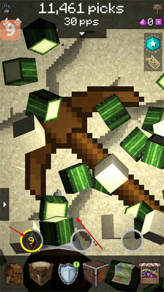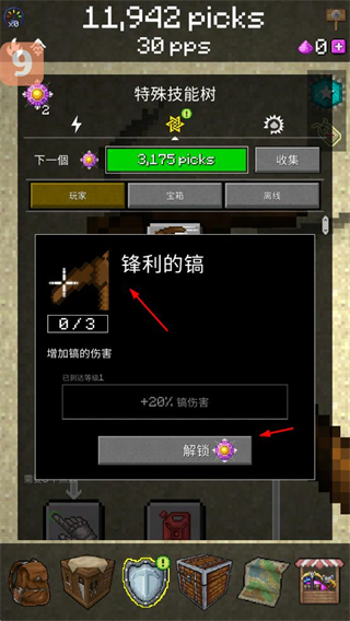 2、升級(jí)技能,消耗資源解鎖技能,增加鎬的傷害,提升挖礦效率。