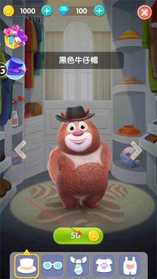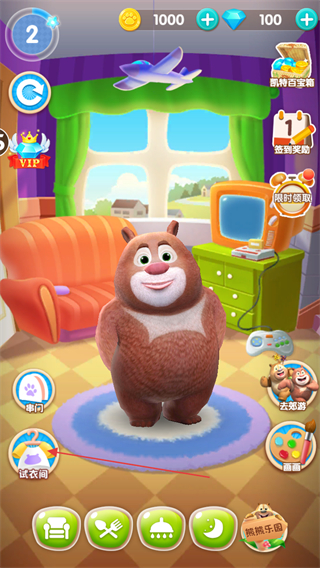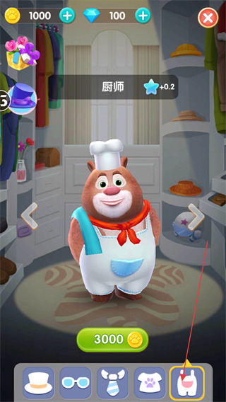 1、進(jìn)入游戲后,在熊大的溫馨小屋中,可以和熊大進(jìn)行互動或是點(diǎn)擊左下角的試衣間按鈕進(jìn)行換裝。
