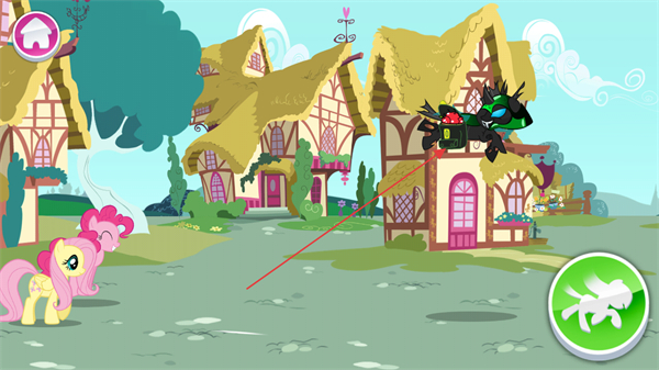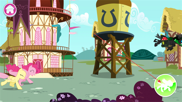 1、操控小馬在小鎮(zhèn)中奔跑,躲避黑色反派的追擊,利用地形周旋。
