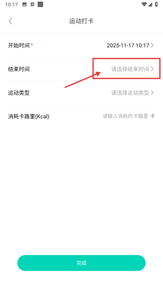 3、在運(yùn)動(dòng)打卡頁(yè)面,點(diǎn)擊結(jié)束時(shí)間選擇框,彈出時(shí)間選擇器。