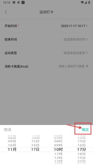 4、在時(shí)間選擇器中選擇合適的結(jié)束時(shí)間后,點(diǎn)擊確定按鈕,完成運(yùn)動(dòng)打卡的時(shí)間設(shè)置。