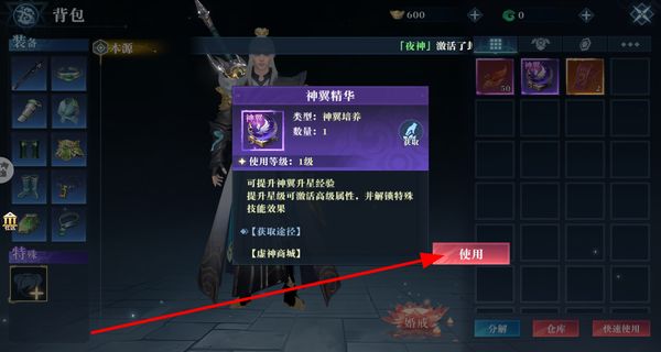 3、在背包中選擇神翼精華等道具并使用,提升神翼星級,激活高級屬性和特殊技能,增強角色能力。
