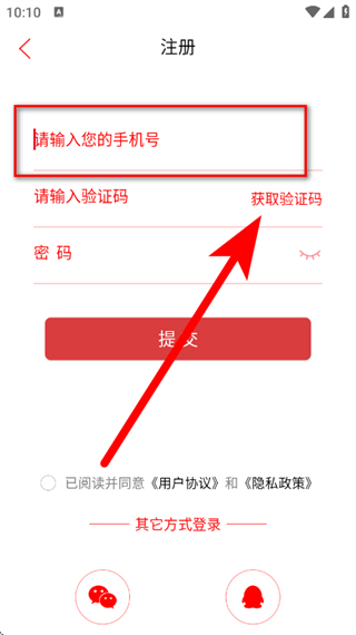 4、在注冊頁面,輸入手機號后,點擊獲取驗證碼。