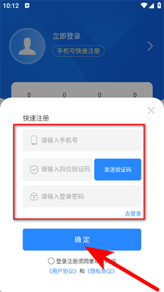 4、輸入手機號,輸入四位驗證碼,設置登錄密碼,勾選同意后,點擊確定,完成賬號注冊操作。