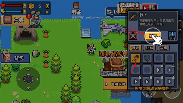 3、收集并管理物品,將物品放入背包,合理利用食物、材料、武器等資源,保障生存與戰(zhàn)斗需求。