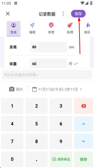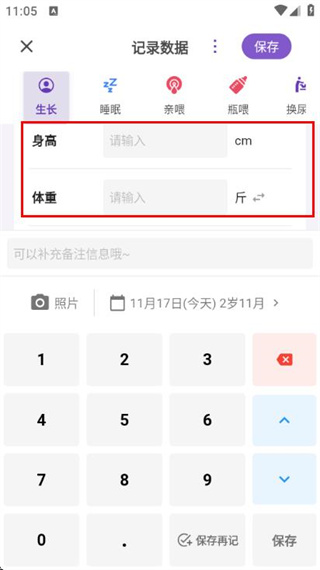 2、進入記錄數(shù)據(jù)頁面后,輸入孩子的身高、體重等信息。